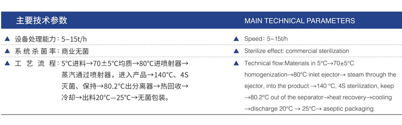 概述:產(chǎn)品先經(jīng)預(yù)熱后,蒸汽直接噴入產(chǎn)品,使產(chǎn)品在瞬時被加熱到設(shè)定溫度,經(jīng)過一定時間的保溫后,通過真空分離器把產(chǎn)品瞬間降溫,并等量蒸發(fā)掉因蒸汽噴入增加的水分,最后產(chǎn)品在無菌條件下冷卻、灌裝。